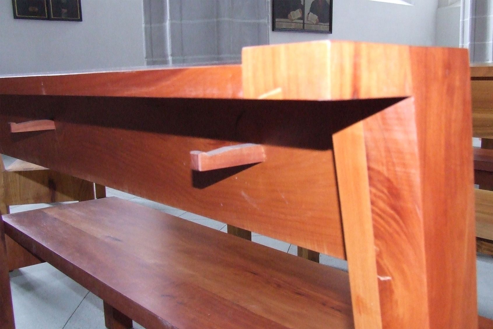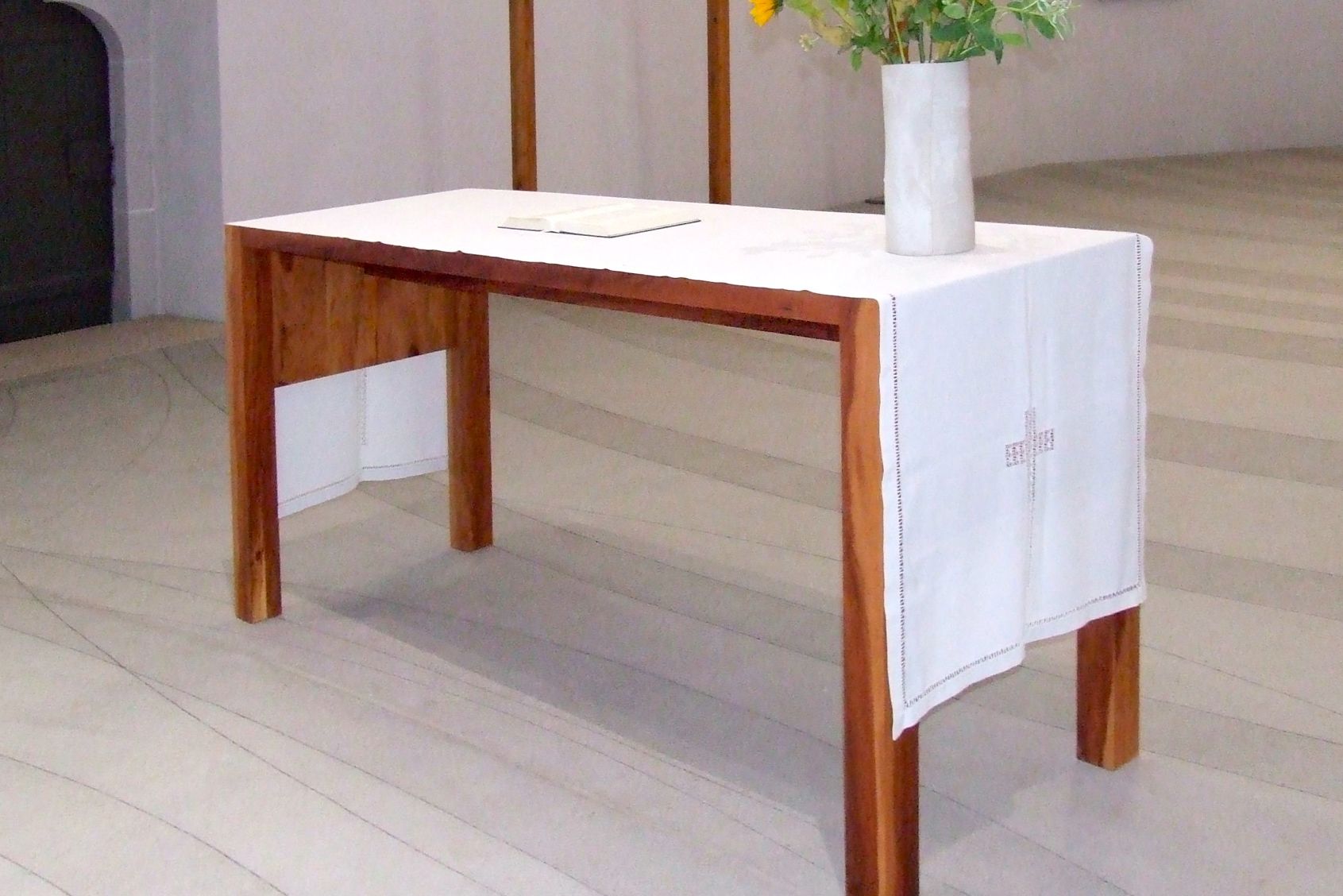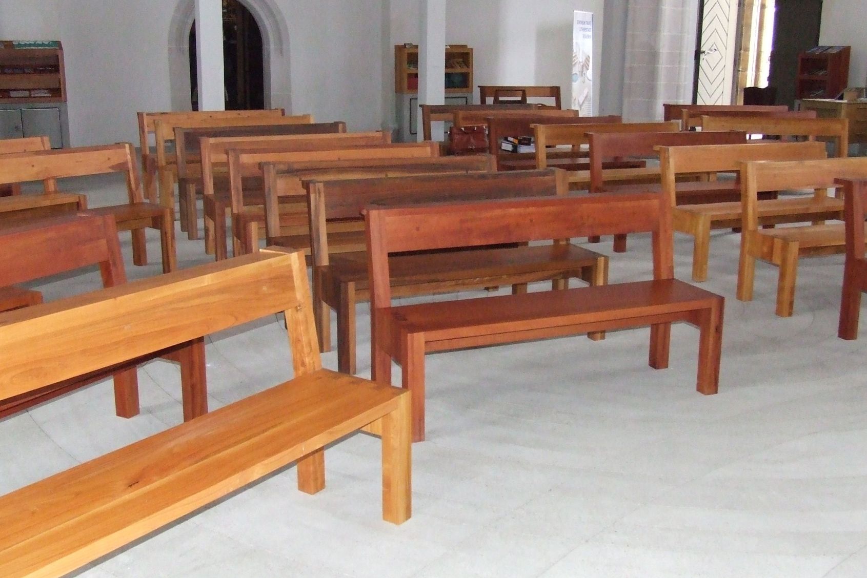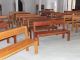 Neubau Sitzbänke mit Rückenlehne, Apfelholz massiv, Birnenholz massiv, Kirschholz massiv, Walnussholz massiv, Sitzbänke ohne Rückenlehne, Kanzel aus Birnenholz, Altar aus Apfelholz , Regal für Broschüren, Regal für Gesangsbücher und Kerzen, Holzkreuz aus Obstholz, Kerzenständer aus Obstholz, Kerzentisch aus Obstholz Aufarbeitung Sakristeitüren