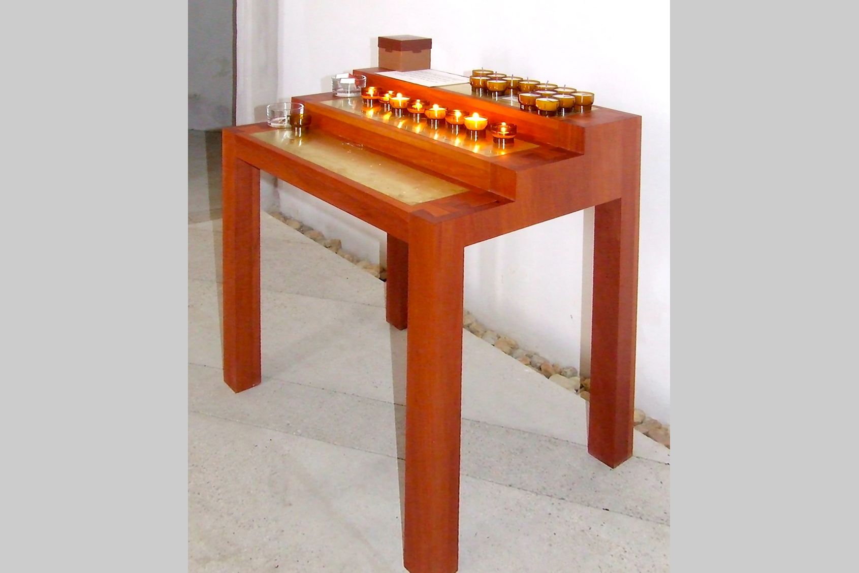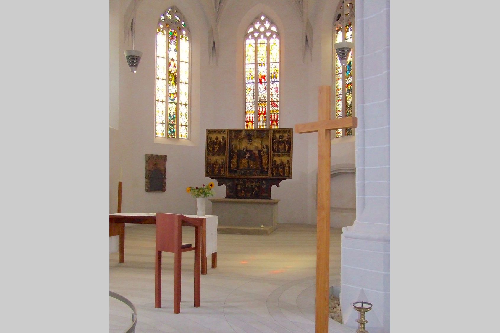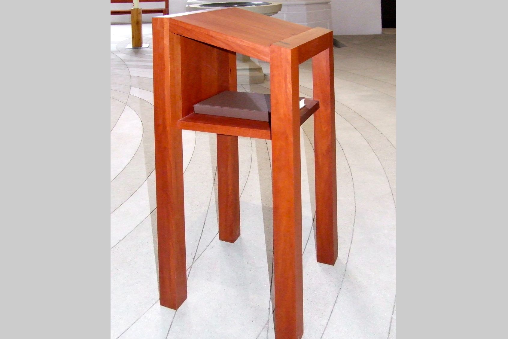 Neubau Sitzbänke mit Rückenlehne, Apfelholz massiv, Birnenholz massiv, Kirschholz massiv, Walnussholz massiv, Sitzbänke ohne Rückenlehne, Kanzel aus Birnenholz, Altar aus Apfelholz , Regal für Broschüren, Regal für Gesangsbücher und Kerzen, Holzkreuz aus Obstholz, Kerzenständer aus Obstholz, Kerzentisch aus Obstholz Aufarbeitung Sakristeitüren